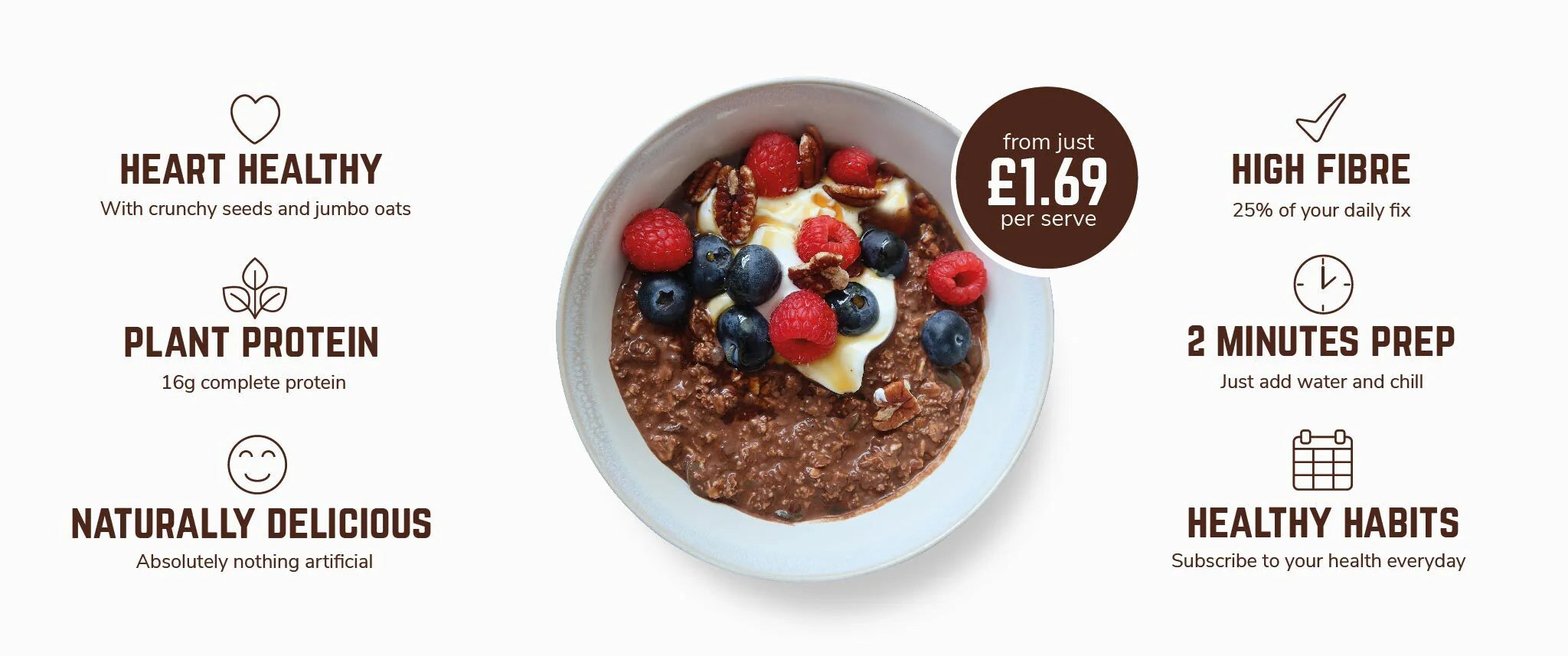 Préparez votre plat en deux minutes. Aucune recette n'est requise. Chaque portion simple d'ingrédients complets vous aide à rester rassasié plus longtemps grâce à un mélange réfléchi de 15 g de protéines végétales complètes (soit autant que ce que vous trouveriez dans trois œufs), de fibres bénéfiques pour l'intestin et de bêta-glucanes et d'oméga-3 bons pour le cœur, réduisant également activement le cholestérol*.